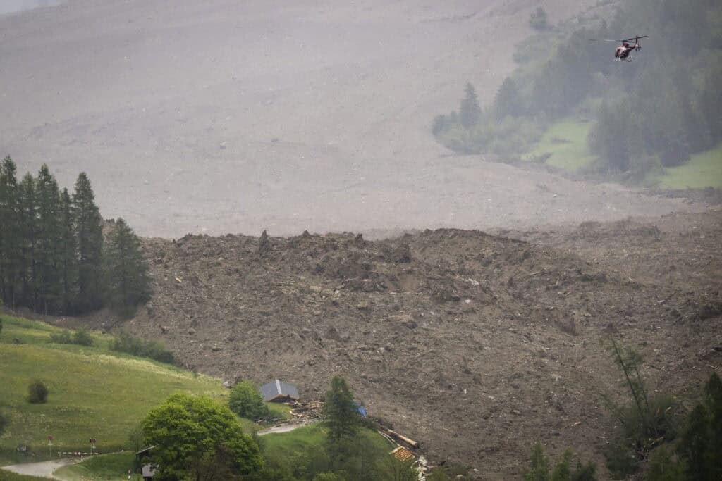 Πλάνα που τραβήχθηκαν από αέρος και προβλήθηκαν από τη δημόσια ελβετική τηλεόραση SRF δείχνουν ένα παχύ στρώμα λάσπης και χώματος να καλύπτει πλήρως ένα μέρος του χωριού, τον ποταμό που το διαρρέει και τις δασωμένες πλαγιές της γειτονικής κοιλάδας.