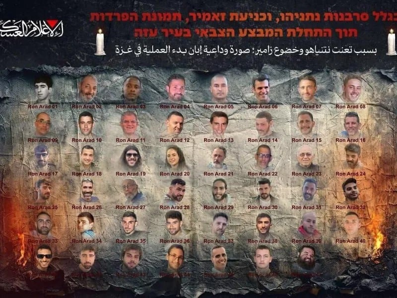 Μια φωτογραφία με τις εικόνες των υπόλοιπων 48 ομήρων που κρατούνται στη Λωρίδα της Γάζας, κατονομάζοντάς τους όλους ως Ρον Αράντ, ενός Ισραηλινού αξιωματικού της Πολεμικής Αεροπορίας που αγνοείται από το 1988, ανήρτησε η Χαμάς την ίδια στιγμή που το Ισραήλ εντείνει τις χερσαίες τους επιχειρήσεις στην καρδιά της Γάζας.