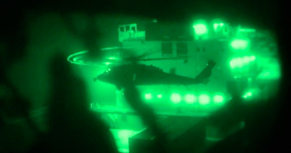 Στο νέο βίντεο που έδωσε στη δημοσιότητα εμφανίζονται οι πεζοναύτες που απογειώνονται με ελικόπτερα από το αποβατικό πλοίο USS Tripoli (LHA-7) και κινούνται πάνω από την Αραβική Θάλασσα για να επιβιβαστούν και να καταλάβουν το εμπορικό πλοίο M/V Touska.