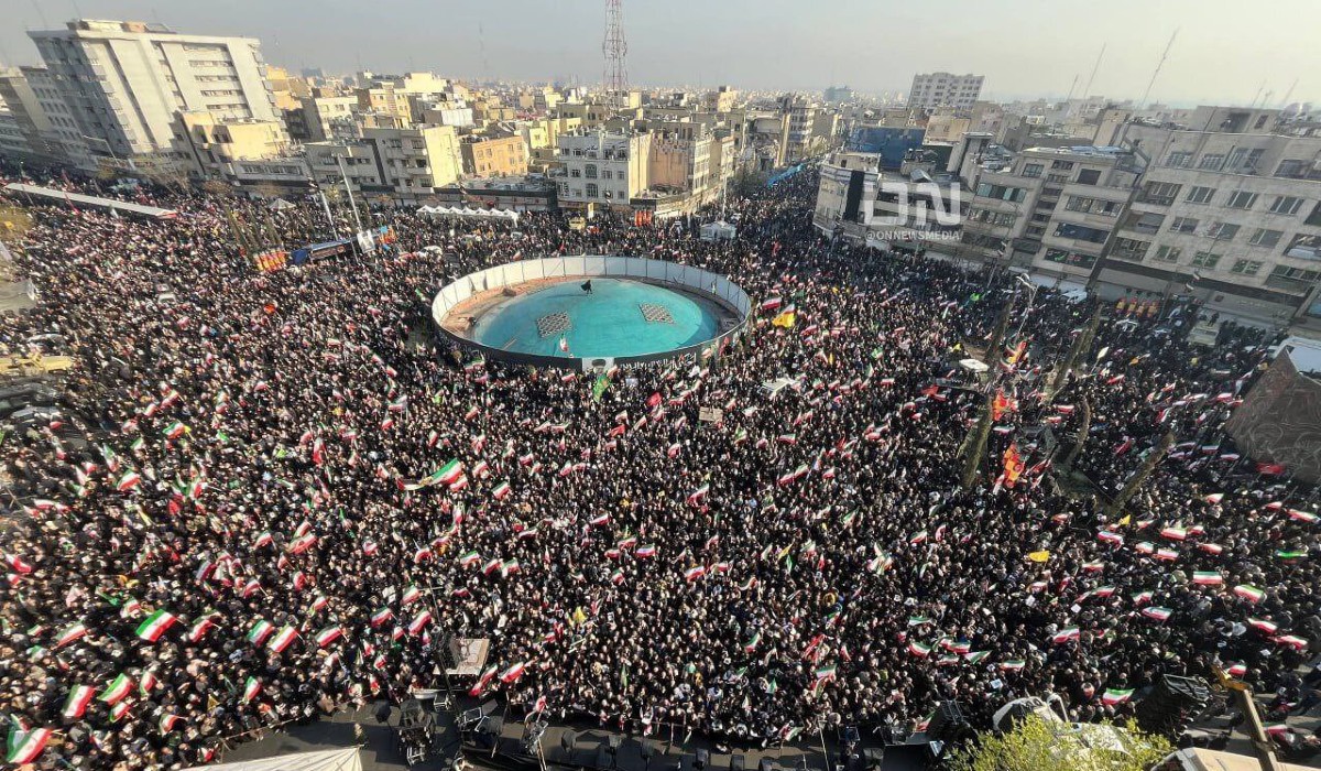 Το πλήθος συγκεντρώθηκε στην πλατεία Ενγκελάμπ στην Τεχεράνη κρατώντας ιρανικές σημαίες και πορτρέτα του Μοζτάμπα Χαμενεΐ, γιου του Αλί Χαμενεΐ, ο οποίος κατείχε προηγουμένως τη θέση αυτή και σκοτώθηκε την πρώτη ημέρα των αμερικανοϊσραηλινών πληγμάτων εναντίον του Ιράν.