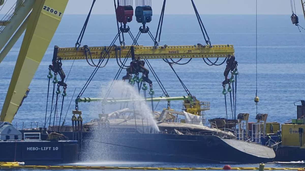 Οι εργασίες επαναλήφθηκαν με το πρώτο φως της ημέρας. Ένας από τους πιο ισχυρούς θαλάσσιους γερανούς στην Ευρώπη χρησιμοποιήθηκε για να ανασυρθεί από το βυθό το μήκους 56 μέτρων Bayesian.