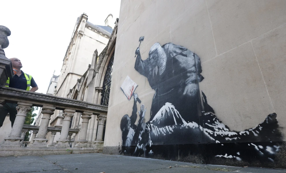 Τον Σεπτέμβριο είχε ζωγραφίσει σε τοίχο του βασιλικού δικαστικού μεγάρου (Royal Courts of Justice) έναν δικαστή να χτυπά με το σφυράκι του έναν διαδηλωτή που κείτεται στο έδαφος κρατώντας ένα αιματοβαμμένο πλακάτ.