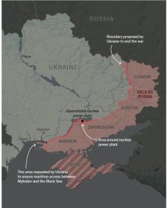 Καθώς οι συμμετέχοντες έσκυβαν πάνω από τον χάρτη, ο Ουκρανός υπουργός Άμυνας Ρουστέμ Ουμέροφ σχεδίασε τη γραμμή επαφής που χωρίζει τις ουκρανικές από τις ρωσικές ελεγχόμενες περιοχές, περνώντας από Χάρκοβο, Λουγκάνσκ, Ντονέτσκ, Ζαπορίζια και Χερσώνα. Ιδιαίτερη έμφαση έδωσε στον πυρηνικό σταθμό της Ζαπορίζια, τον οποίο κύκλωσε, προειδοποιώντας για τον κίνδυνο «πυρηνικής καταστροφής» λόγω της πλημμελούς συντήρησης από τις ρωσικές δυνάμεις. Έδειξε επίσης τη λωρίδα της Κινμπούρν, εξηγώντας ότι η ανάκτησή της θα εξασφάλιζε ασφαλή πρόσβαση στα ναυπηγεία του Μικολάιβ.