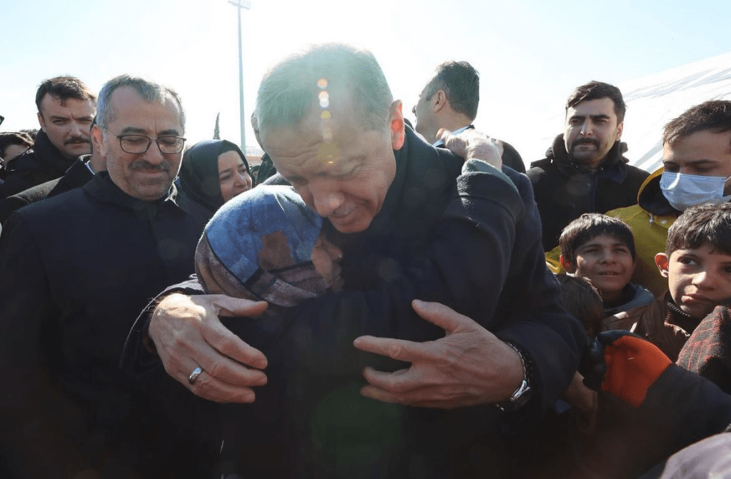 Ο κ. Ερντογάν έγινε δεκτός με θερμές εκδηλώσεις από εκατοντάδες σεισμοπαθείς στις —προσεκτικά χορογραφημένες— τηλεοπτικές μεταδόσεις κατά την περιοδεία του. Οι κάμερες ζούμαραν σε ηλικιωμένη που έκλαιγε στον ώμο του σε μια από αυτές.