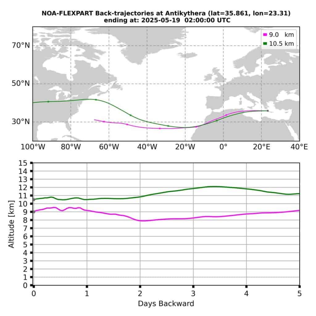 Ακόμη, στις εικόνες 2 και 3 παρουσιάζονται οι οπισθοτροχιές μεταφοράς (backtrajectories) του καπνού και η πιθανή πηγή προέλευσής του, όπως υπολογίστηκαν με το μοντέλο FLEXPART της ομάδας NOA – ReACT. Τα αποτελέσματα, σύμφωνα με τη σχετική ανακοίνωση, επιβεβαιώνουν ότι ο καπνός προέρχεται από τη Βόρεια Αμερική, και συγκεκριμένα από την περιοχή των μεγάλων πυρκαγιών στον Καναδά.