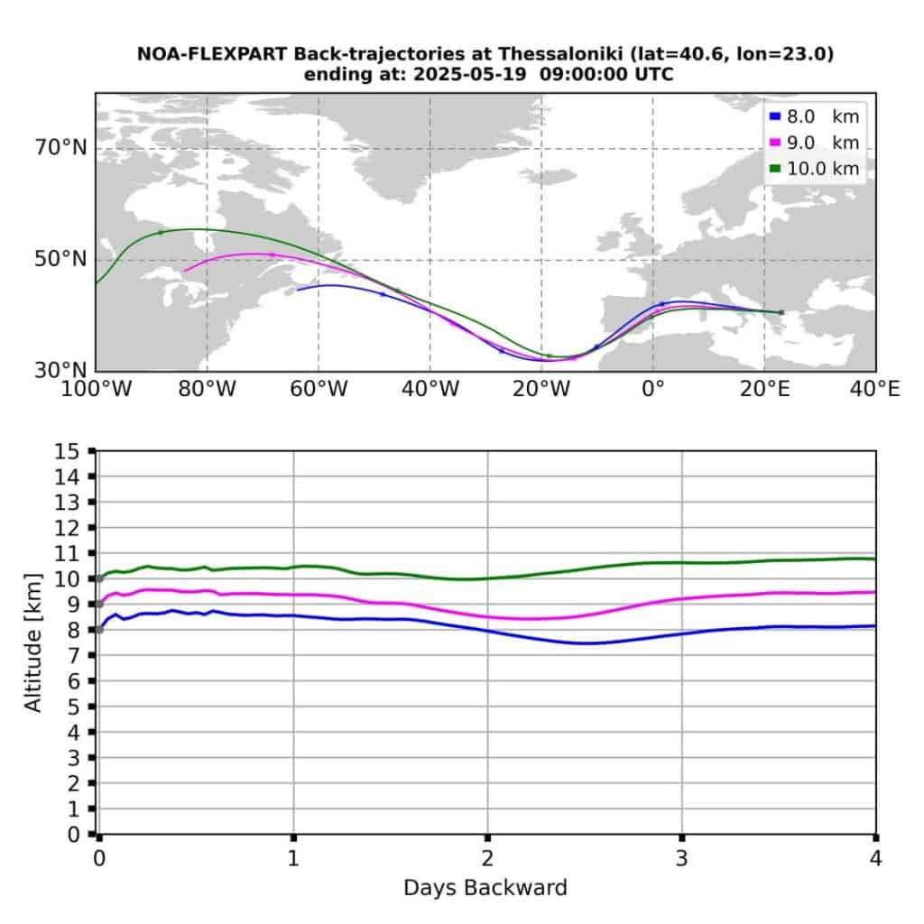 Ακόμη, στις εικόνες 2 και 3 παρουσιάζονται οι οπισθοτροχιές μεταφοράς (backtrajectories) του καπνού και η πιθανή πηγή προέλευσής του, όπως υπολογίστηκαν με το μοντέλο FLEXPART της ομάδας NOA – ReACT. Τα αποτελέσματα, σύμφωνα με τη σχετική ανακοίνωση, επιβεβαιώνουν ότι ο καπνός προέρχεται από τη Βόρεια Αμερική, και συγκεκριμένα από την περιοχή των μεγάλων πυρκαγιών στον Καναδά.