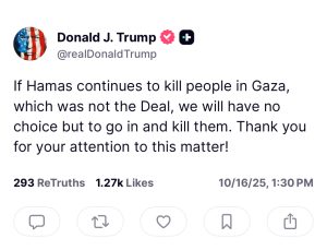 Ο Αμερικανός πρόεδρος Ντόναλντ Τραμπ προχώρησε σε σκληρή προειδοποίηση προς τη Χαμάς, δηλώνοντας ότι οι Ηνωμένες Πολιτείες «δεν θα έχουν άλλη επιλογή» από το να επέμβουν στρατιωτικά, εάν συνεχιστούν οι εκτελέσεις αμάχων στη Λωρίδα της Γάζας. Η δήλωση έγινε μέσω της πλατφόρμας Truth Social, όπου ο Τραμπ έγραψε: «Εάν η Χαμάς συνεχίσει να σκοτώνει ανθρώπους στη Γάζα, κάτι που δεν ήταν μέρος της συμφωνίας, δεν θα έχουμε άλλη επιλογή από το να πάμε και να τους σκοτώσουμε».