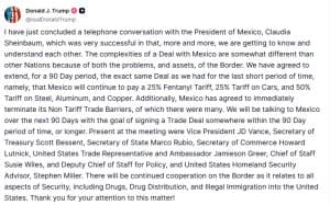 Σύμφωνα με την ανάρτηση του Τραμπ στο Truth Social, οι διαπραγματεύσεις για μια μόνιμη εμπορική συμφωνία θα συνεχιστούν κατά τη διάρκεια αυτής της περιόδου. Ο ίδιος παραδέχτηκε ότι οι συνομιλίες με το Μεξικό είναι περίπλοκες λόγω των προβλημάτων και των πλεονεκτημάτων που συνδέονται με τα σύνορα των δύο χωρών.