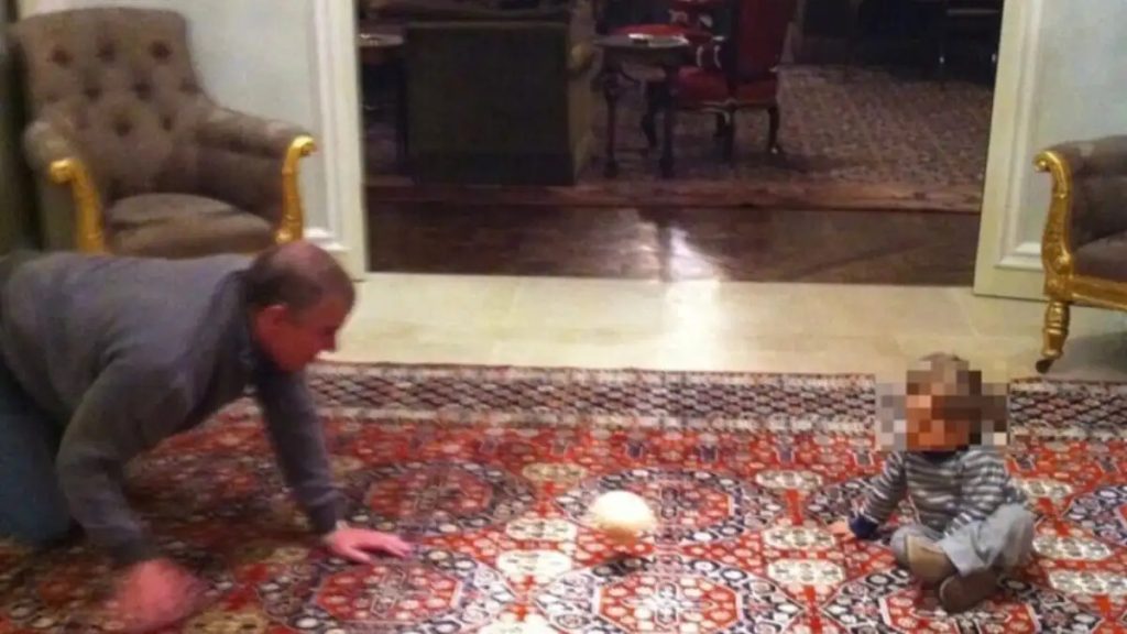 Στις φωτογραφίες που τραβήχτηκαν το 2011, ο τέως πρίγκιπας Άντριου είναι σκυμμένος απέναντι από το μωρό σε ένα χαλί και κυλάει μια μπάλα που μοιάζει γυναικείο στήθος.