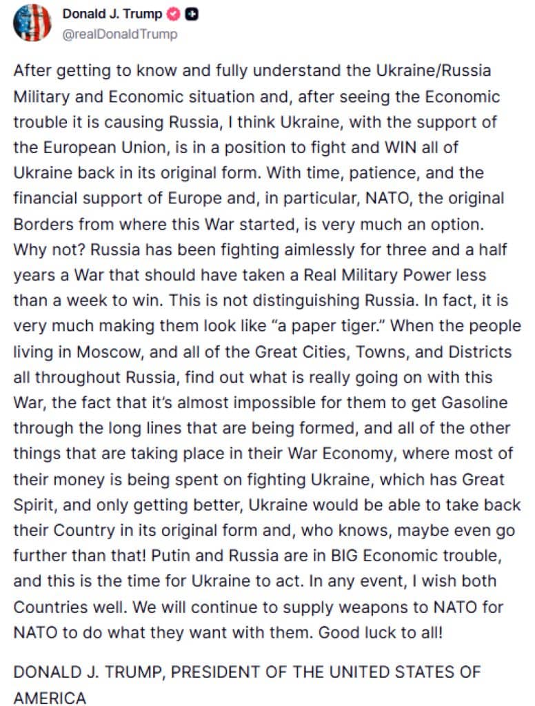 «Πάνε τώρα τρεισήμισι χρόνια που η Ρωσία διεξάγει χωρίς σαφή κατεύθυνση έναν πόλεμο που μια Πραγματική Στρατιωτική Δύναμη θα τον είχε κερδίσει σε λιγότερο από μία εβδομάδα» υποστήριξε ο Τραμπ, εκτιμώντας ότι η χώρα του Βλαντίμιρ Πούτιν «μοιάζει πολύ με χάρτινη τίγρη».