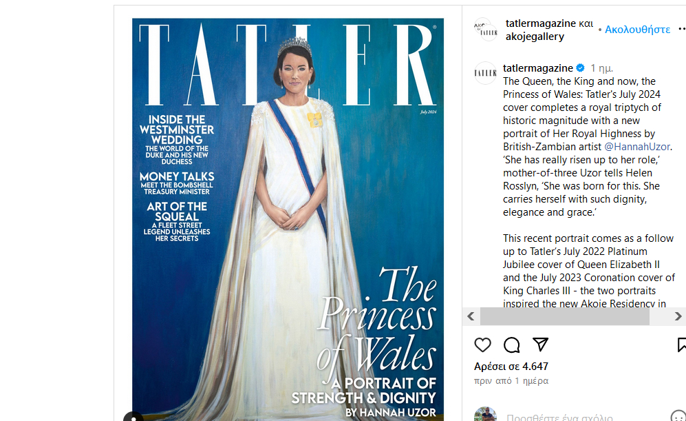 Το ιδιαίτερο έργο που απεικονίζει την Κέιτ Μίντλετον θα φιλοξενηθεί στο εξώφυλλο του περιοδικού Tatler στο τεύχος Ιουλίου και είναι στο πλαίσιο σειράς με πορτρέτα μελών της βασιλικής βρετανικής οικογένειας.