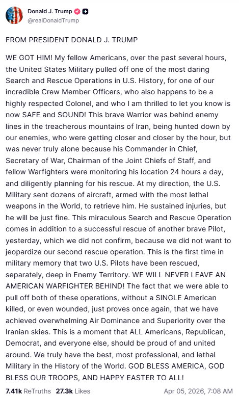 «Στη διάρκεια των τελευταίων ωρών ο αμερικανικός στρατός έφερε σε πέρας μια από τις πιο τολμηρές επιχειρήσεις έρευνας και διάσωσης στην αμερικανική ιστορία για να βοηθήσει έναν από τους απίστευτούς αξιωματικούς πληρώματός μας, ο οποίος τυχαίνει να είναι και ένας ιδιαίτερα σεβαστός σμήναρχος, και είμαι στην ευχάριστη θέση να ανακοινώσω ότι είναι πλέον ΣΩΟΣ ΚΑΙ ΑΣΦΑΛΗΣ!», σύμφωνα με ανακοίνωση του Τραμπ την οποία ανήρτησε στο Χ η εκπρόσωπος Τύπου του Λευκού Οίκου Κάρολαϊν Λέβιτ.