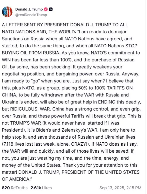 Παράλληλα, αναφερόμενος και στην Κίνα, εξέφρασε την άποψη ότι αυτό, «σε συνδυασμό με το ΝΑΤΟ, ως ομάδα, να επιβάλλει δασμούς 50% έως 100% στην Κίνα, οι οποίοι θα καταργηθούν πλήρως μετά το τέλος του πολέμου με τη Ρωσία και την Ουκρανία, θα συμβάλει επίσης σημαντικά στον τερματισμό αυτού του θανατηφόρου, αλλά και γελοίου πολέμου». «Η Κίνα ασκεί ισχυρό έλεγχο, ακόμη και επιρροή, στη Ρωσία, και αυτοί οι ισχυροί δασμοί θα σπάσουν αυτή την επιρροή», τονίζει ο Αμερικανός πρόεδρος.
