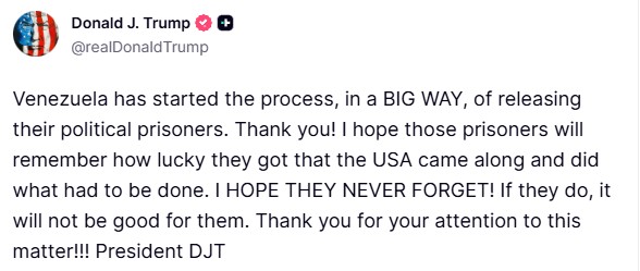 «Η Βενεζουέλα έχει ξεκινήσει τη διαδικασία απελευθέρωσης των πολιτικών της κρατουμένων, και μάλιστα σε μεγάλη κλίμακα», έγραψε ο Τραμπ στην πλατφόρμα Truth Social.
