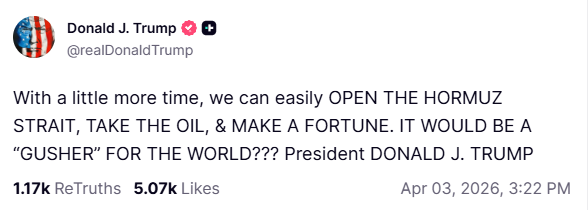 «Με λίγο παραπάνω χρόνο, μπορούμε εύκολα να ΑΝΟΙΞΟΥΜΕ ΤΟ ΣΤΕΝΟ ΤΟΥ ΧΟΡΜΟΥΖ, να ΠΑΡΟΥΜΕ ΤΟ ΠΕΤΡΕΛΑΙΟ ΚΑΙ ΝΑ ΚΑΝΟΥΜΕ ΜΙΑ ΠΕΡΙΟΥΣΙΑ», δήλωσε ο Τραμπ σε μια ανάρτηση στο Truth Social.