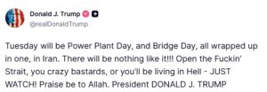 Ο Ντόναλντ Τραμπ έθεσε ως ορόσημο την προσεχή Τρίτη, κάνοντας λόγο για «ημέρα εργοστασίων ενέργειας και ημέρα γεφυρών» στο Ιράν, αναφορά που ερμηνεύεται ως άμεση απειλή για την καταστροφή των κρίσιμων υποδομών της χώρας. Στην ανάρτησή του, ο πρόεδρος των ΗΠΑ χρησιμοποίησε υβριστικούς χαρακτηρισμούς απευθυνόμενος στην ηγεσία του Ιράν, προειδοποιώντας πως σε περίπτωση που δεν υπάρξει συμμόρφωση, η χώρα θα βρεθεί αντιμέτωπη με συνθήκες «κόλασης».