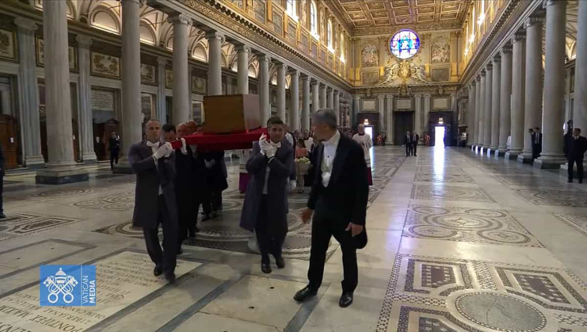 Η σορός έφτασε στην εκκλησία με πομπή έξι χιλιομέτρων, μέσα από το ιστορικό κέντρο της ιταλικής πρωτεύουσας, και την οποία περίμεναν σαράντα «φίλοι του Φραγκίσκου». Πρόκειται για μετανάστες, φυλακισμένους, τρανσέξουαλ, άστεγους, τους οποίους ο Πάπας είχε γνωρίσει προσωπικά και που είχε προσπαθήσει να κατανοήσει και να βοηθήσει με τον δικό του, άμεσο τρόπο. Ο καθένας θα αφήσει πάνω στον τάφο ένα άσπρο τριαντάφυλλο, το λουλούδι που αγαπούσε περισσότερο από κάθε άλλο ο Χόρχε Μάριο Μπεργκόλιο.
