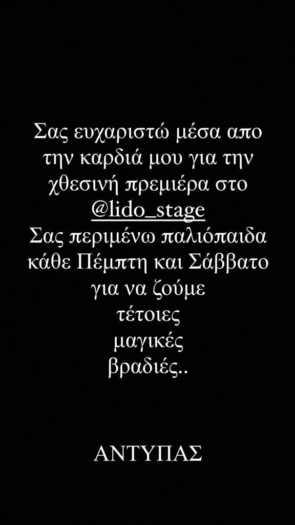 Χθες, ο Αντύπας θέλησε να ευχαριστήσει τον κοινό που κατέκλυσε το “Lido Stage” στην πρεμιέρα του ανεβάζοντας ένα story στον προσωπικό του λογαριασμό στα social media.