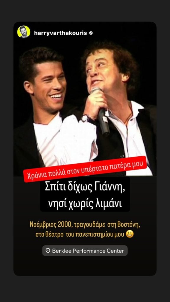 “Χρόνια πολλά στον υπέρτατο πατέρα μου. Σπίτι δίχως Γιάννη, νησί χωρίς λιμάνι”, έγραψε ο Χάρης Βαρθακούρης στο story που ανέβασε.