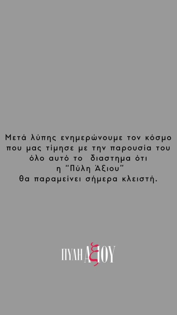 “Μετά λύπης ενημερώνουμε τον κόσμο που μας τίμησε με την παρουσία του όλο αυτό το διάστημα ότι η “Πύλη Άξιου” θα παραμείνει σήμερα κλειστή” γράφουν στο story που ανέβασαν οι άνθρωποι της “Πύλης Αξιού”.