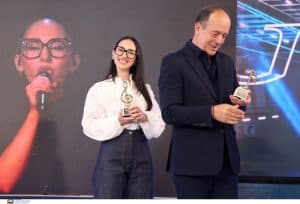 Μετά την εντυπωσιακή της εμφάνιση και την επιστροφή της στην Ελλάδα, η Κλαυδία βραβεύτηκε σήμερα, Πέμπτη 22 Μαΐου, από την ΕΡΤ. Ο πρόεδρος του Διοικητικού Συμβουλίου της ΕΡΤ, Γιάννης Παπαδόπουλος, υποδέχτηκε την τραγουδίστρια και τον Φωκά Ευαγγελινό στο Ραδιομέγαρο.