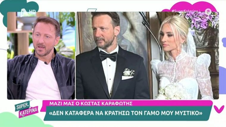 Ο Κώστας Καραφώτης αναφέρθηκε και στον γάμο του με την Κάτια, αποκαλύπτοντας πως ήθελε να τον κρατήσει μυστικό, κάτι που τελικά δεν κατέστη εφικτό. «Δεν κατάφερα να κρατήσω τον γάμο μου μυστικό, όπως ήθελα. Διέρρευσαν φωτογραφίες και υπήρξαν κανάλια που κάλυψαν το γεγονός. Ήταν κάτι που ήθελα να το κρατήσω αυστηρά προσωπικό, γιατί για μένα ο γάμος είναι μια πολύ ιδιαίτερη στιγμή που δεν χρειάζεται να γίνεται δημόσιο θέμα. Παρόλα αυτά, περάσαμε πολύ όμορφα και η μέρα αυτή ήταν ξεχωριστή για όλους μας».