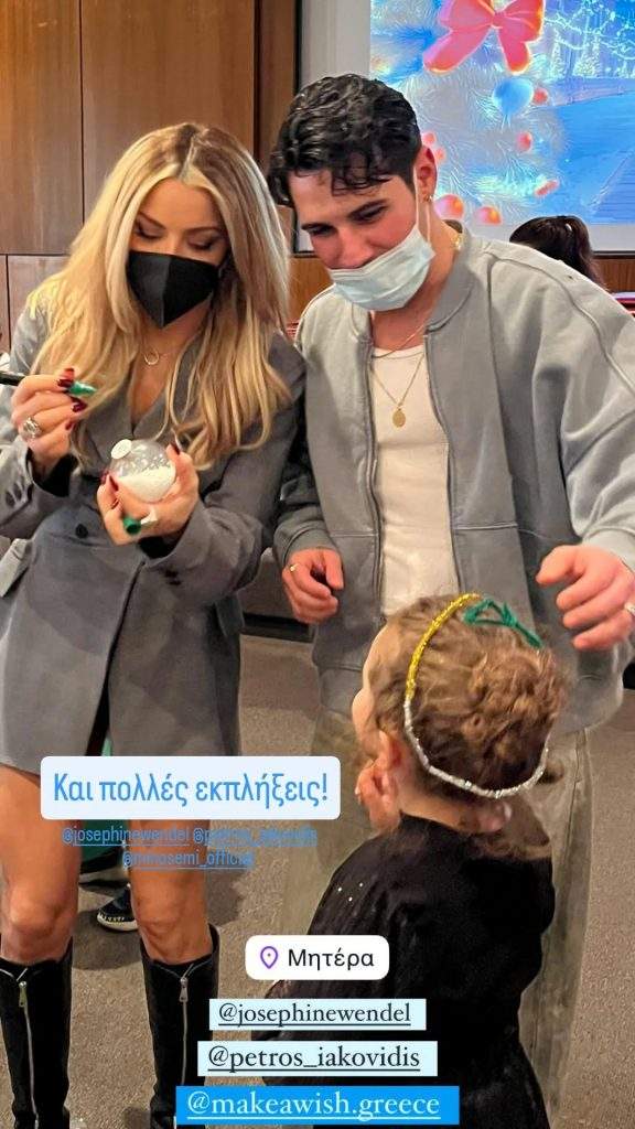 Η Ζόζεφιν και Πέτρος Ιακωβίδης επισκέφτηκαν χθες (18/12) το Νοσοκομείο “Μητέρα” και την πτέρυγα παίδων. Οι δύο τραγουδιστές πήραν μέρος στην εκδήλωση που είχε διοργανώσει το Make-A-Wish Ελλάδος (Κάνε-Μια-Ευχή-Ελλάδος) για τα παιδιά με σοβαρά προβλήματα υγείας.