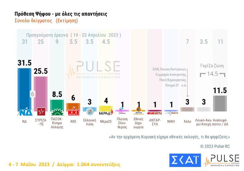 Η δημοσκόπηση της Pulse που παρουσιάστηκε σήμερα στο δελτίο ειδήσεων του έδειξε ότι η διαφορά της ΝΔ από τον ΣΥΡΙΖΑ είναι στο 6,5%.