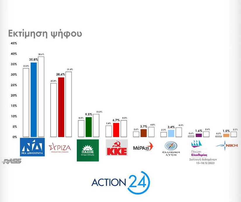 Η πανελλήνια έρευνα έρχεται λίγες ώρες πριν τις εκλογές της 21ης Μαΐου και εμφανίζει τη Νέα Δημοκρατία στην εκτίμηση ψήφου να συγκεντρώνει ποσοστό 35,8%, τον ΣΥΡΙΖΑ 28,6%, το ΠΑΣΟΚ 9,5%, το ΚΚΕ 6,7%, το ΜέΡΑ25 3,7% και την Ελληνική Λύση 3,4%.
