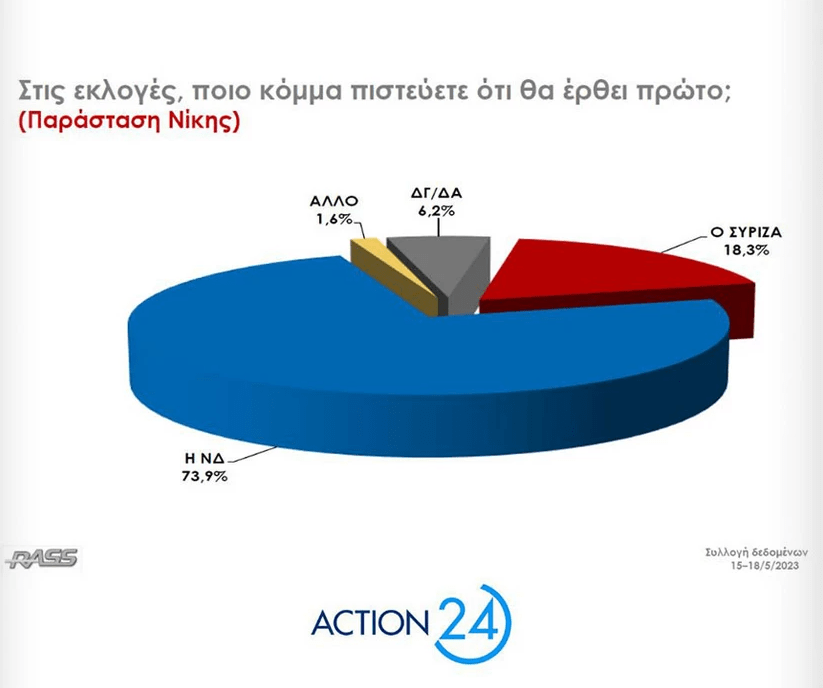 Στην παράσταση νίκης, η Νέα Δημοκρατία φαντάζει το απόλυτο φαβορί στη συνείδηση των περισσότερων συγκεντρώνοντας ποσοστό 73,9% έναντι 18,3% του ΣΥΡΙΖΑ. Άλλο κόμμα απαντά το 1,6% των ερωτηθέντων.