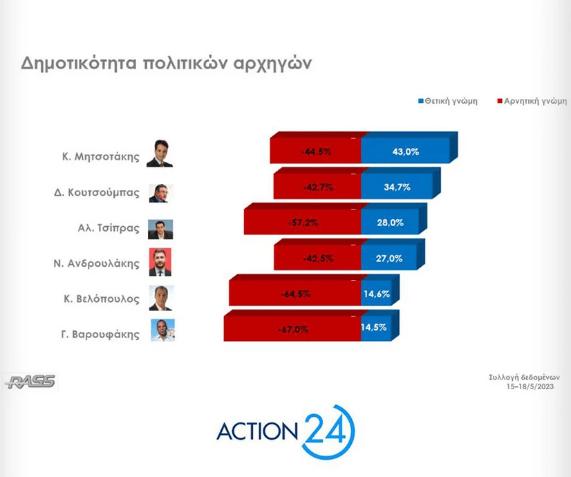 Στη δημοτικότητα των πολιτικών αρχηγών, ο Κυριάκος Μητσοτάκης διατηρείται στην κορυφή με 43%, ενώ ο Δημήτρης Κουτσούμπας παραμένει στην δεύτερη θέση, μπροστά από τον Αλέξη Τσίπρα. Ο γγ της ΚΕ του ΚΚΕ καταγράφεται με 34,7% θετικές γνώμες έναντι 28% του Αλέξη Τσίπρα. Στο 27% είναι ο Νίκος Ανδρουλάκης, ο Κυριάκος Βελόπουλος στο 14,6% και ο Γιάνης Βαρουφάκης στο 14,5%.