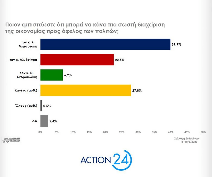 Στην ερώτηση ποιον εμπιστεύονται περισσότερο για τη σωστή διαχείριση της οικονομίας, οι πολίτες απαντούν σε ποσοστό 39,9%, τον Κυριάκο Μητσοτάκη. Ακολουθεί η απάντηση «κανέναν» με 27,8%, ο Αλέξης Τσίπρας καταγράφει ποσοστό 22,5% και ο Νίκος Ανδρουλάκης, 6,9%.