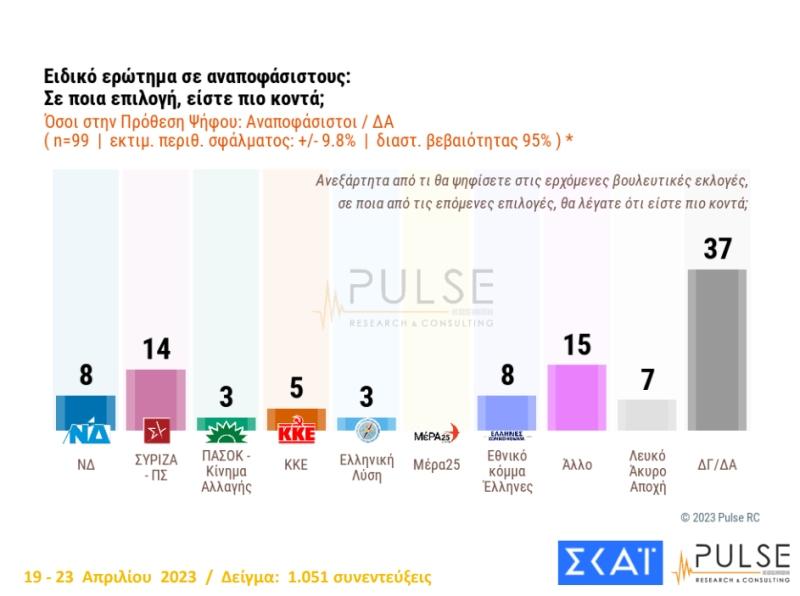 Στη δημοσκόπηση ετέθη και το ειδικό ερώτημα σε όσους δήλωσαν αναποφάσιστοι: «Σε ποια επιλογή είστε πιο κοντά;» Και πάλι, το 37% εξ αυτών επέμειναν στο «δεν ξέρω/δεν απαντώ», το 7% επιλέγει λευκό/άκυρο/αποχή. Το 8% δηλώνει ότι είναι πιο κοντά στη ΝΔ, το 14% πιο κοντά στον ΣΥΡΙΖΑ, το 3% πιο κοντά στο ΠΑΣΟΚ-ΚΙΝΑΛ, το 5% πιο κοντά στο ΚΚΕ, το 3% πιο κοντά στην Ελληνική Λύση, το 8% πιο κοντά στο Εθνικό Κόμμα Ελληνες, ενώ «άλλο» δηλώνει το 15% των αναποφάσιστων.