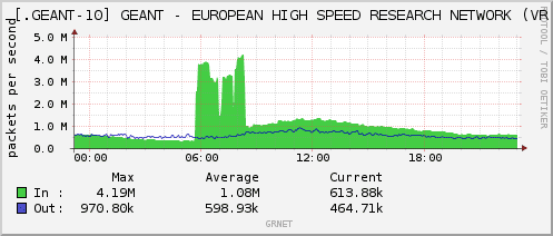Τεκμηρίωση επίθεσης: Από τα παρακάτω δημοσίως διαθέσιμα γραφήματα (Εικόνες 3 και 4) φαίνεται η σταδιακή και ομαλή αύξηση της κίνησης στις 31/5 και 1/6 όπου δεν εντοπίστηκε επίθεση. Η ομαλή κίνηση αυξάνεται σταδιακά μέχρι ένα μέγιστο μέσα στην ημέρα και σταδικά υποχωρεί. Αντιθέτως, τις πρωινές ώρες της 29/5 εντοπίζεται η κακόβουλη κίνηση ως διακριτή κορυφή νωρίτερα της ομαλής κορύφωσης της κίνησης. Στις 30/5 η αύξηση λόγω της κακόβουλης κίνησης ξεπερνάει σαφώς τη συνολική κίνηση του δικτύου ΕΔΥΤΕ προς το Internet. Στις Εικόνες 1 και 2 φαίνεται εστιασμένη η επίθεση ως αυξημένος ρυθμός επεξεργασίας δικτυακών πακέτων εισερχόμενων από το Internet στους κόμβους «ΕΙΕ» και «ΚΩΛΕΤΤΗ» αντίστοιχα.
