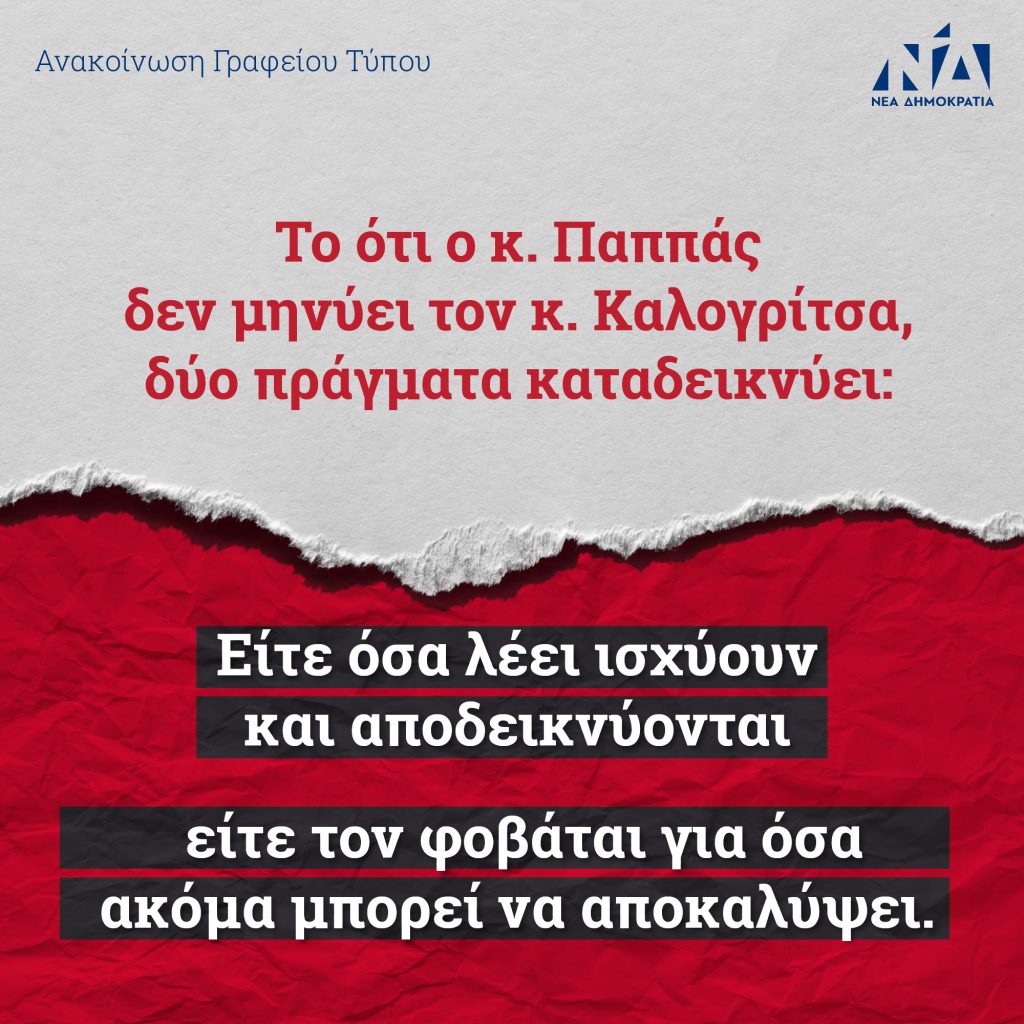 Το ότι ο κ. Παππάς δεν μηνύει τον κ. Καλογρίτσα, δύο πράγματα καταδεικνύει: Είτε όσα λέει ισχύουν και αποδεικνύονται, είτε τον φοβάται για όσα ακόμα μπορεί να αποκαλύψει.