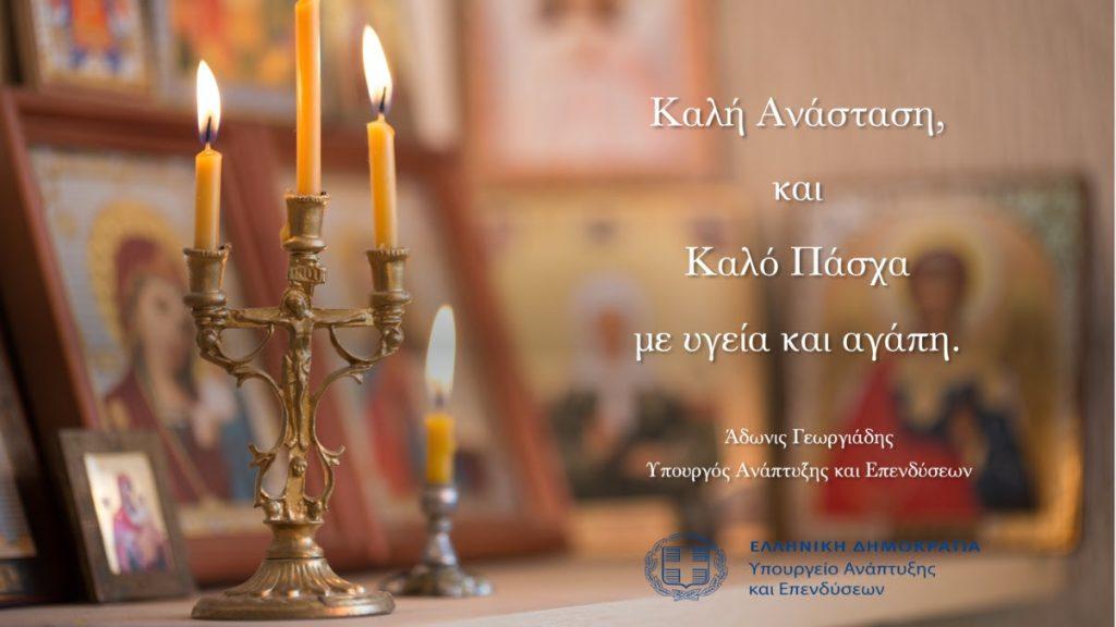 Ο υπουργός Ανάπτυξης και Επενδύσεων, Άδωνις Γεωργιάδης, έστειλε τις δικές του ξεχωριστές ευχές για το Πάσχα σε όλους τους Έλληνες και ευχήθηκε καλή ανάσταση σε όλους.