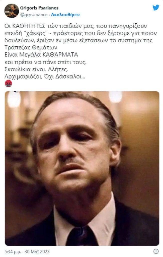 «Δεν είναι η πρώτη φορά που ο κ. Ψαριανός καταφέρεται εναντίον των εκπαιδευτικών και του λειτουργήματός τους. Εχθές, μετά την πρωτοφανή κατάρρευση της Τράπεζας Θεμάτων, εξέφρασε για άλλη μία φορά το μένος του για τους/τις εκπαιδευτικούς και την ΟΛΜΕ, χαρακτηρίζοντάς τους με χυδαίες ύβρεις.