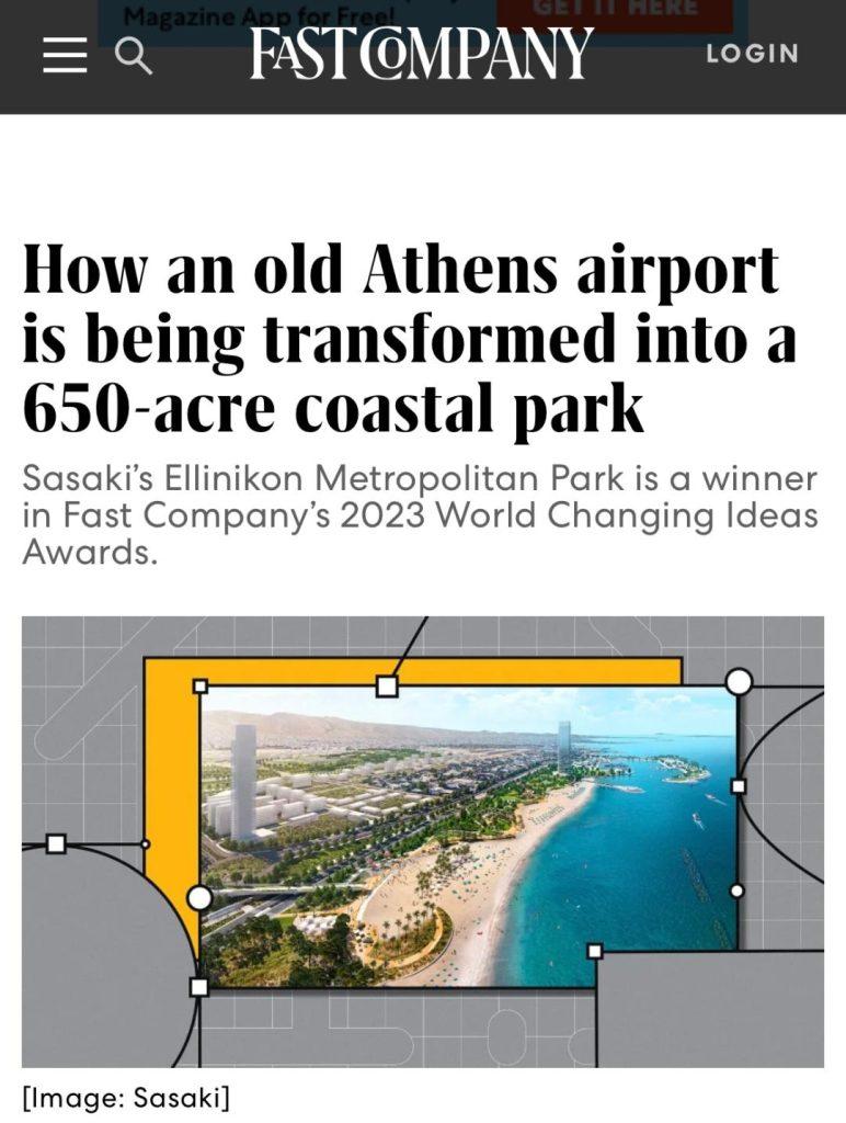 Όπως επισημαίνεται στην αναφορά του Fast Company, ενός ταχύτατα αναπτυσσόμενου περιοδικού με αναγνωσιμότητα που ξεπερνά τα 3 εκατ, μια από τις πιο αξιοσημείωτες αστικές αναπλάσεις-μεταμορφώσεις του κόσμου βρίσκεται τώρα σε εξέλιξη στην Αθήνα. Το παροπλισμένο αεροδρόμιο της πόλης, θα μετατραπεί σε Μητροπολιτικό Πάρκο Ελληνικού, σχεδιασμένο από την εταιρεία αρχιτεκτονικής τοπίου Sasaki και διάσπαρτο με γειτονιές του 21ου αιώνα, αναφέρει επίσης, επισημαίνοντας ότι αποτελεί τον νικητή του βραβείου World Changing Ideas 2023 της Fast Company στην κατηγορία Urban Design.