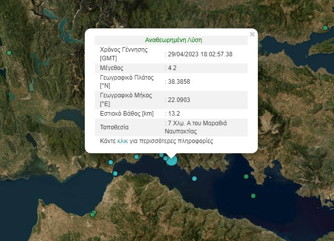 Σύμφωνα με το Γεωδυναμικό Ινστιτούτο, το επίκεντρο του σεισμού εντοπίζεται 7χλμ. ανατολικά νοτιοανατολικά του Μαραθιά Ναυπακτίας, ενώ το εστιακό βάθος υπολογίζεται στα 5 χιλιόμετρα.