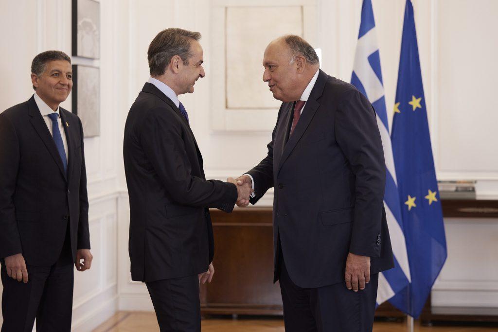 Με τον υπουργό Εξωτερικών της Αιγύπτου Σαμέχ Σούκρι, ο οποίος επισκέπτεται την Αθήνα, συναντήθηκε σήμερα στο Μέγαρο Μαξίμου ο πρωθυπουργός Κυριάκος Μητσοτάκης.