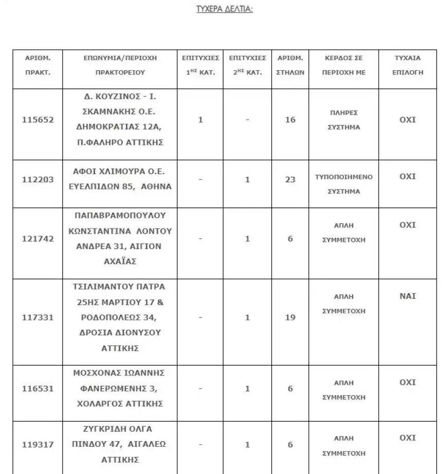 Το τυχερό δελτίο του Τζόκερ συμπληρώθηκε σε πρακτορείο ΟΠΑΠ στο Παλαιό Φάληρο, ενώ την ίδια ώρα πέντε ήταν οι νικητές με τυχερά δελτία στη δεύτερη κατηγορία (5αρια) καθένας εκ των οποίων κερδίζει το ποσό των 39.818,75 ευρώ.