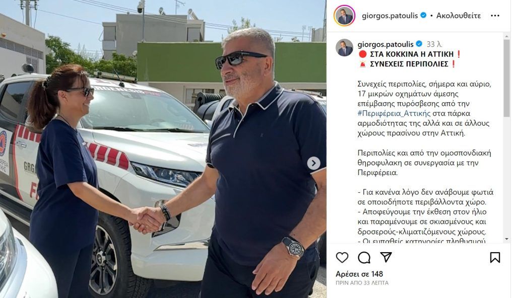 Για τις περιπολίες μικρών οχημάτων άμεσης πυρόσβεσης από την Περιφέρεια Αττικής αλλά και τις οδηγίες σχετικά με τον καύσωνα ενημέρωσε με ανάρτησή του στο Instagram ο Περιφερειάρχης Αττικής, Γιώργος Πατούλης.