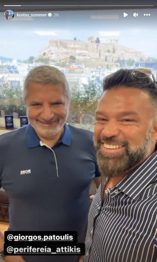 Στο Instagram story που ανήρτησε στον προσωπικό του λογαριασμό ο Κώστας Σόμμερ εμφανίζεται μαζί με τον Περιφερειάρχη Αττικής, Γιώργο Πατούλη, ο οποίος, μεταξύ άλλων, του εύχεται καλή επιτυχία και καλή δύναμη.