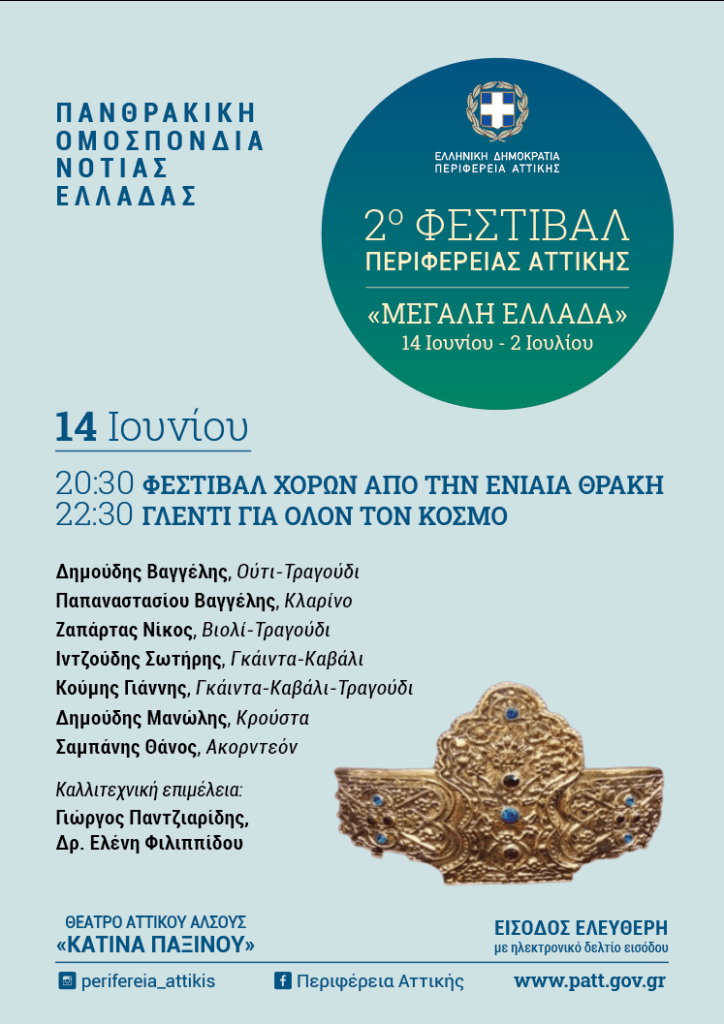 Μια μεγάλη αγκαλιά για όλους τους πολιτιστικούς συλλόγους της Αττικής ανοίγει η Περιφέρεια Αττικής και ο Περιφερειάρχης, Γιώργος Πατούλης, από σήμερα 14 Ιουνίου μέχρι και τις 2 Ιουλίου στο Θέατρο «Κατίνα Παξινού» του Αττικού Άλσους, στο πλαίσιο του 2ου Φεστιβάλ Περιφέρειας Αττικής.