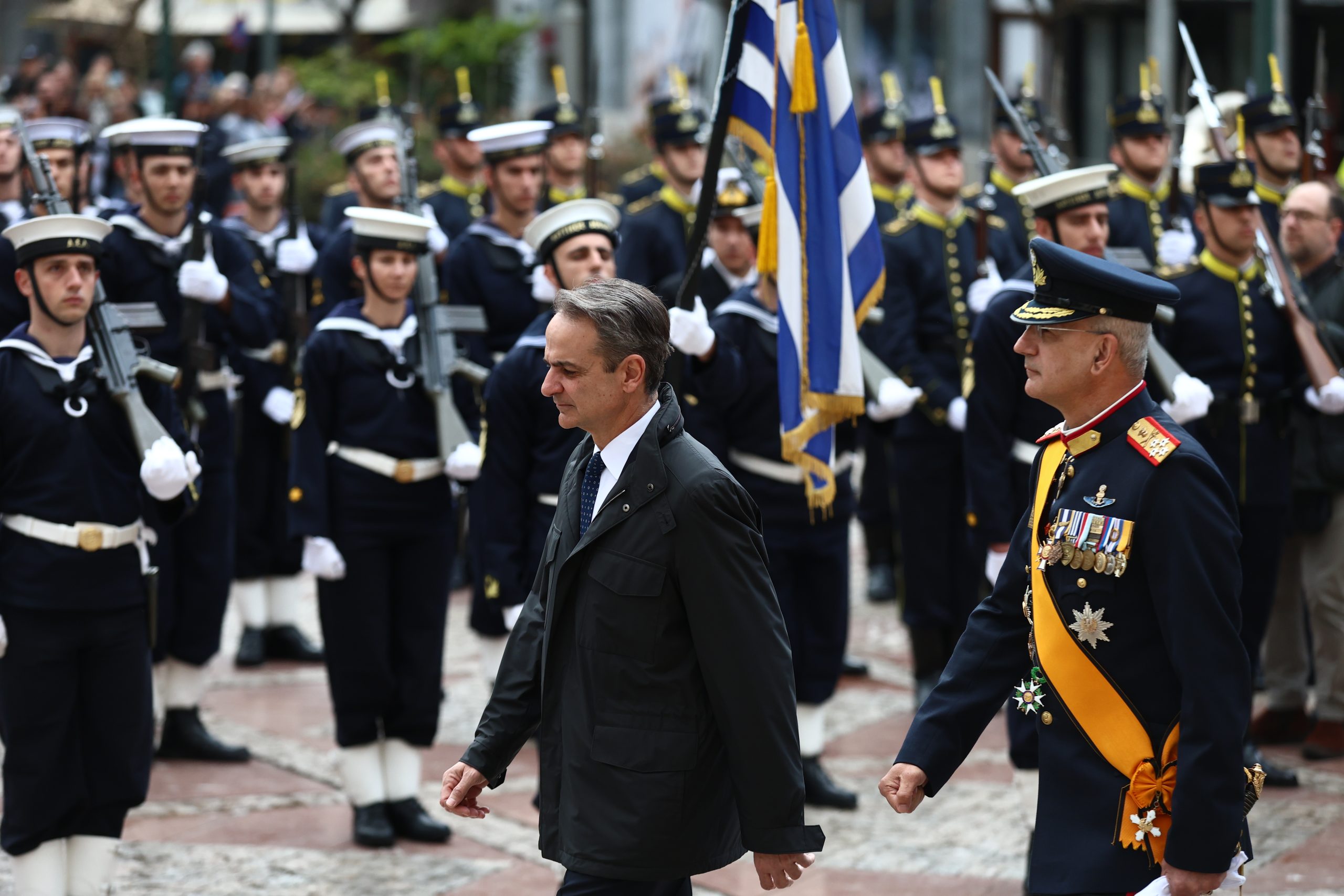 Ο πρωθυπουργός, που θα παρακολουθήσει τη μεγάλη στρατιωτική παρέλαση στο Σύνταγμα, έφτασε λίγο πριν τις 10:00, με άγημα των Ενόπλων Δυνάμεων να αποδίδει τιμές.