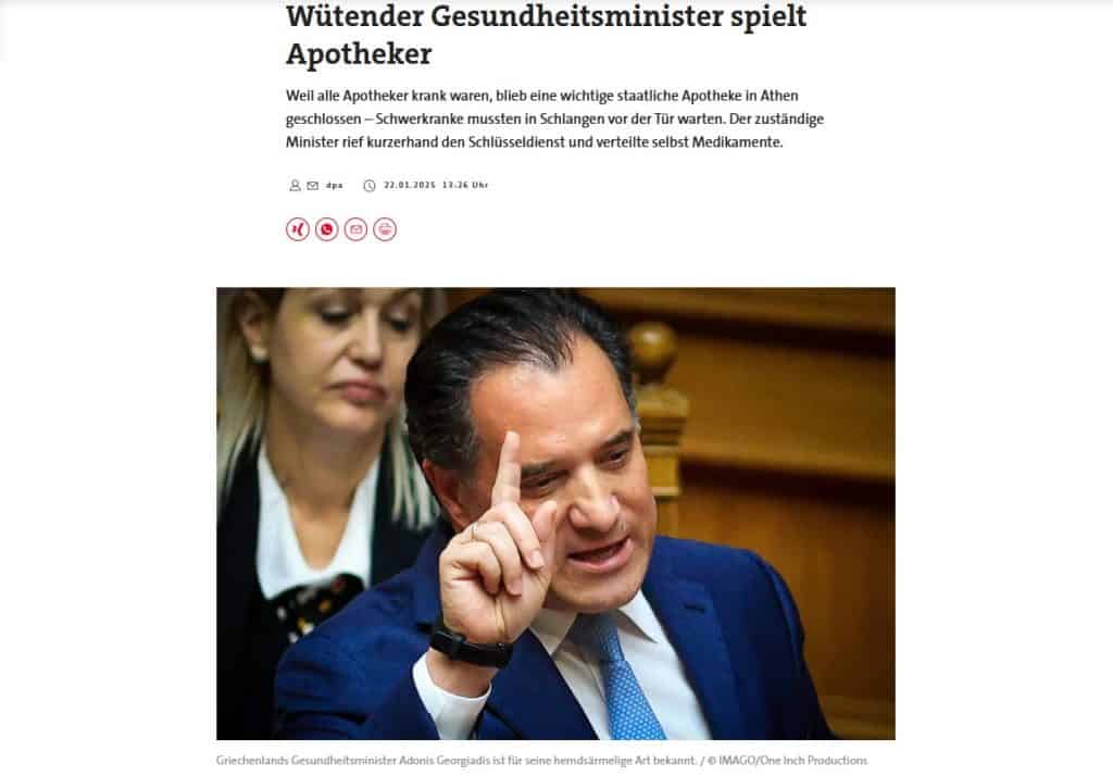 Η άμεση αντίδραση του Άδωνι Γεωργιάδη και επίλυση του προβλήματος, αρχικά στο φαρμακείο του ΕΟΠΥΥ στη Λ. Αλεξάνδρας, αλλά και γενικότερα με την ανακοίνωση συγκεκριμένων μέτρων, δεν πέρασε απαρατήρητο από τα ραντάρ των γερμανικών ΜΜΕ. Ειδικότερα, στη γερμανική εφημερίδα των φαρμακοποιών «Pharmazeutische Zeitung» είχε εκτενές άρθρο για τον Έλληνα υπουργό Υγείας με τίτλο «Εξοργισμένος υπουργός Υγείας στον ρόλο φαρμακοποιού».