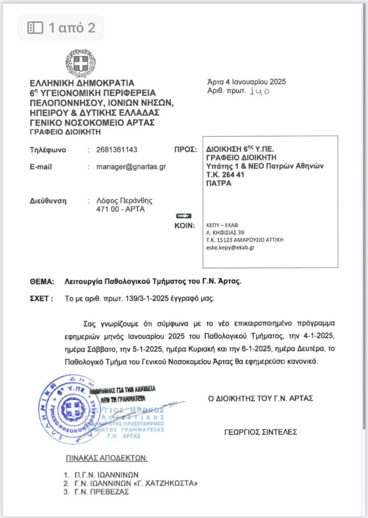 Με ανάρτησή του στο Χ, ο υπουργός Υγείας Άδωνις αναφέρθηκε στο Γενικό Νοσοκομείο Άρτας, τονίζοντας πως συνεχίζεται κανονικά η λειτουργία του, δημοσιεύοντας και την σχετική ανακοίνωση της 6ης ΥΠΕ, στην οποία τονίζεται: «Σας γνωρίζουμε ότι σύμφωνα με το νέο επικαιροποιημένο πρόγραμμα εφημεριών μηνός Ιανουαρίου 2025 του παθολογικού Τμήματος, την 4-1-2025, ημέρα Σάββατο, την 5-1-2025, ημέρα Κυριακή και την 6-1-2025, ημέρα Δευτέρα, το Παθολογικό Τμήμα του Γενικού Νοσοκομείου Άρτας θα εφημερεύσει κανονικά».
