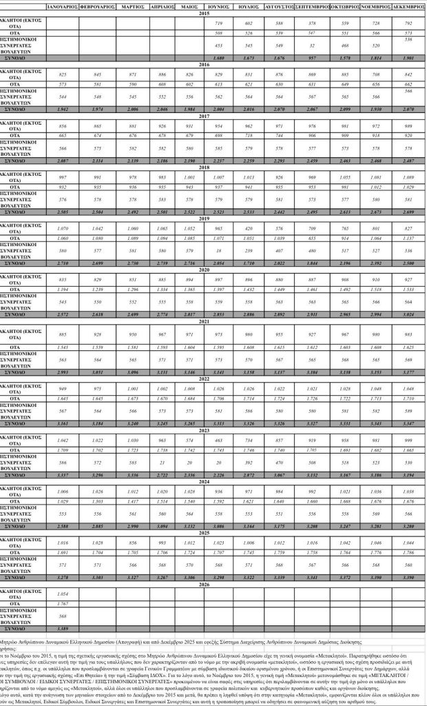 Τον Ιανουάριο του 2026 το σύνολο των μετακλητών υπαλλήλων ήταν 3.389 επιμερισμένοι ως εξής: