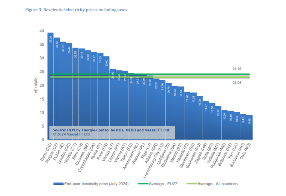 7. Η πολιτική της Κυβέρνησης Μητσοτάκη στο πεδίο των τιμών ηλεκτρικής ενέργειας αποδίδει καρπούς καθ’ όλο το δύσκολο διάστημα της ενεργειακής κρίσης έως και σήμερα, με τρανή απόδειξη τον μηνιαίο πίνακα τιμών που ανακοινώνει το HEPI (Household Energy PriceIndex), ο οποίος μας κατατάσσει σταθερά κάτω από το μέσο όρο της Ε.Ε. στις τιμές των οικιακών καταναλωτών ηλεκτρικής ενέργειας. Μάλιστα, στον σχετικό πίνακα, απεικονίζονται οι τιμές (συμπεριλαμβανομένων φόρων και λοιπών χρεώσεων) ηλεκτρικής ενέργειας των οικιακών καταναλωτών για τον Ιούλιο του 2024, όπου η χώρα μας βρίσκεται στην 18η θέση μεταξύ 33 ευρωπαϊκών κρατών.