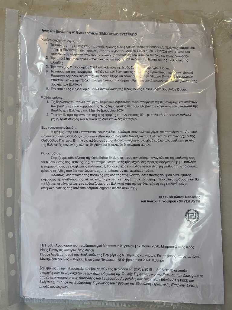 Όπως γνωστοποίησε ο βουλευτής, έξω από το πολιτικό του γραφείο στη Θεσσαλονίκη βρήκε τοιχοκολλημένη επιστολή της Νεολαίας, στην οποία αναφέρει ότι στηρίζει κάθε κίνηση της Ορθόδοξης Εκκλησίας κατά της επιλογής του συμπληρωματικά με τον αφορισμό, χαρακτηρίζει «μη επιθυμητή» την παρουσία του σε εκδηλώσεις πολιτιστικού, θρησκευτικού και άλλου τύπου και θα πράξει τα μέγιστα για να υπενθυμίζει στον λαό την επιλογή του κ. Σιμόπουλου μέχρι την απομάκρυνσή του από οποιοδήποτε δημόσιο αξίωμα.